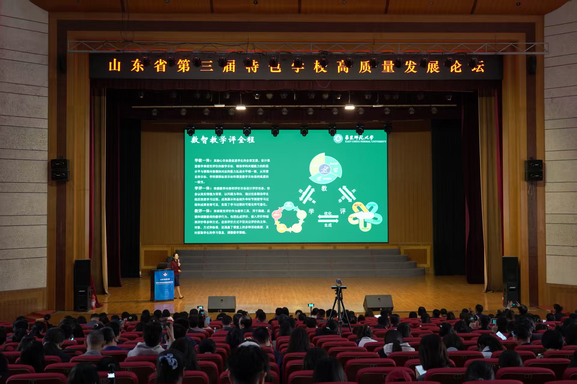 论坛期间,邀请多位专家进行了主旨报告和专题报告。山东省教育学会特色学校建设研究专业委员会副会长兼秘书长、齐鲁师范学院教师教育学院院长毕诗文教授和青岛大学基础教育研究院院长、青岛大学附属学校总校长马勇军教授,分别主持了主旨报告和专家报告。青岛西海岸新区区委教育工委委员、区政府教育督导室总督学孙美青,中国教育学会中小学信息技术教育专业委员会理事长、华东师范大学博士生导师顾小清教授,江南大学博士生导师、二级教授陈明选,北京师范大学博士生导师董艳教授,浙江师范大学杜华教授,苏州工业园星洋学校校长肖晨等,分别围绕数据赋能教育评价变革、数智深化学校数字化转型、教育数字化理论、AI时代教学范式重构、智能教研组织变革、“学为中心”课堂实践等主题分享了前沿观点与经验。